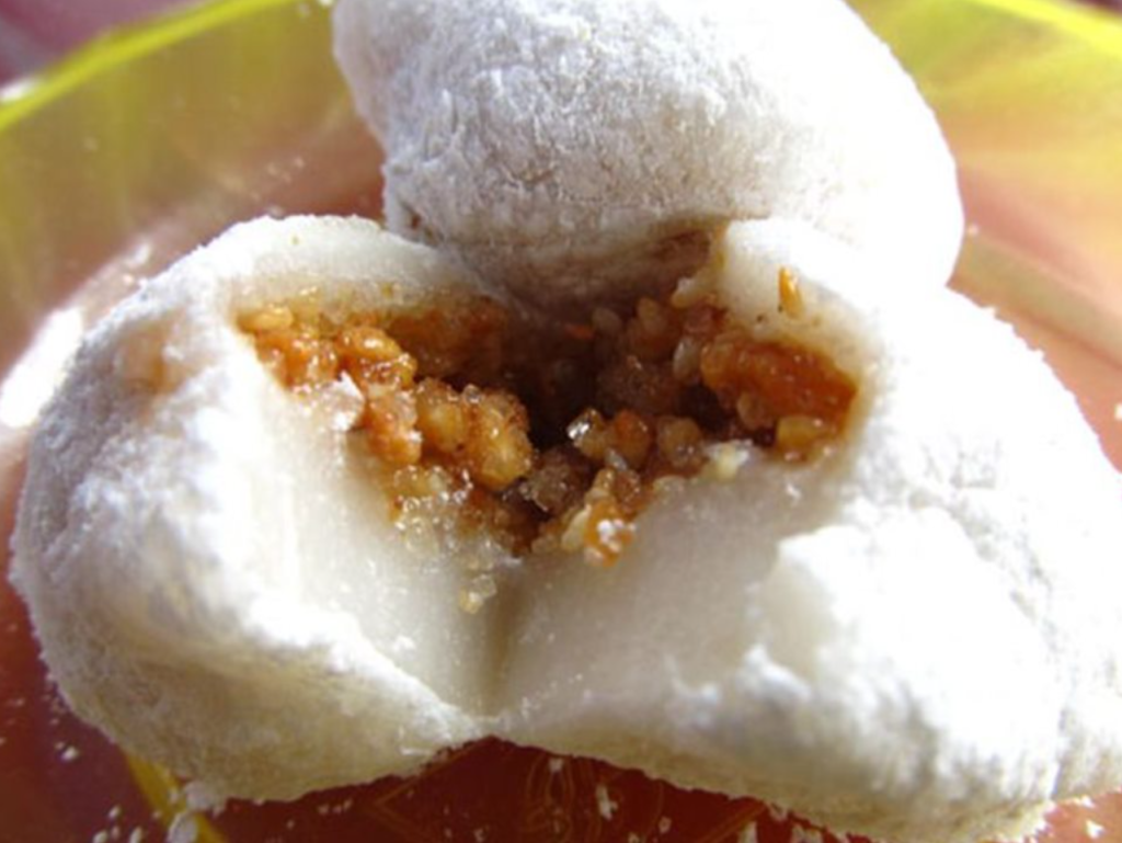 Features: This dessert has nothing to do with mango, except its shape. It is made of glutinous rice filled with a sweet mixture of peanuts and sesame seeds. The texture is really soft and chewy.